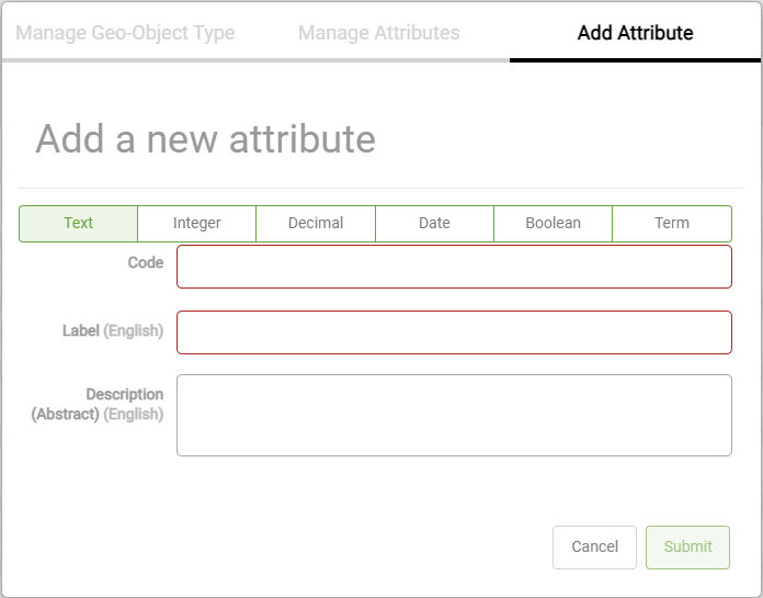 5. ໜ້າຕ່າງ Add a new attribute ຈະເປີດຂຶ້ນ. ເລືອກປະເພດຂໍ້ມູນຂອງຄຸນລັກສະນະໃໝ່ທີ່ທ່ານຕ້ອງການເພີ່ມສໍາລັບ Geo-Object Type ແລະ ຕື່ມຂໍ້ມູນໃສ່ທຸກຊ່ອງຂໍ້ມູນທີ່ຕ້ອງການ ແລະ ຊ່ອງຂໍ້ມູນທາງເລືອກທີ່ກ່ຽວຂ້ອງ.