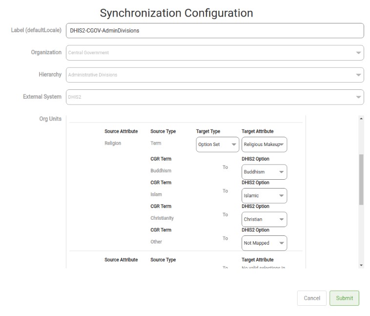 | Org Units       | A mapping between the Geo-Object Types in the selected GeoPrism Registry hierarchy and the types in the DHIS2 instance. |